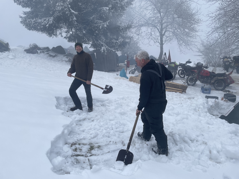 Seine Bleibe in traumhafter „Südhanglage” fordert ihren Preis;Zum Glück sind genügend Schaufeln da.